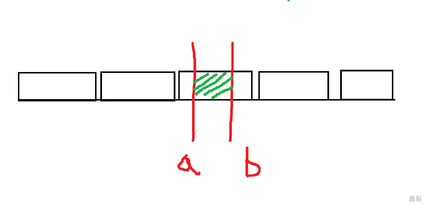 而且此时,显然 $a$ 所在的散块(散点)的右端点并非 $a$ 所在块的右端点,而是 $b$,因此在代码里我们还要加一些特判。