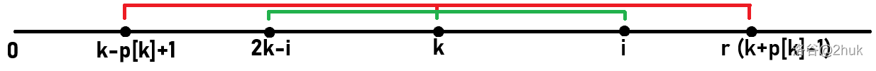 此时 $i$ 可以继承 $2k-i$ 的信息,因为它们都在 $[k-p_k+1,k+p_k-1]$ 这个回文子串中且位置对称。 - $p_{2k-i} \ge r-i+1$:从 $r-i+1$ 开始,继续暴力扩展; - 否则:$p_i = p_{2k-i}$。 -