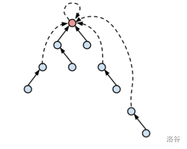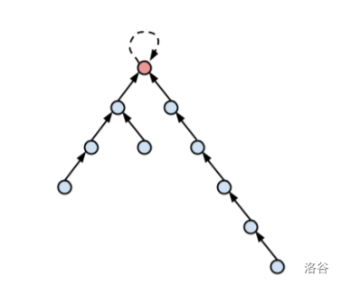 首先根据题目描述,我们能很轻松建立起一个图论模型。给出一张 n 个结点 n 条边的有向图,对于每个点 i 都有一条到 a_i 的有向边。注意到原题中给出的条件说明这张图是弱连通的,问题即为最少改变多少个有向边的终点能使得从任意结点出发经过恰好 k 条边都能到达 1。