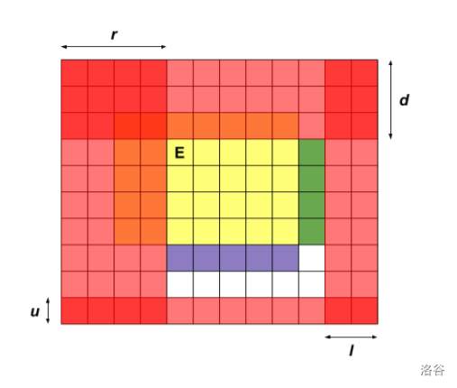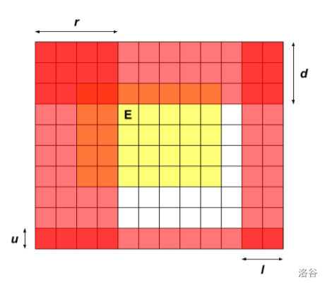 发现一堆机器人的状态不好描述,所以我们反向考虑,不移动机器人,而是去移动整个网格图和出口,并描述出口的移动情况。注意到描述出口移动情况的关键在于它移动的最远端。具体来讲,我们用一个四元组 $(l,r,d,u)$ 表示出口往左最多移动了 $l$ 格,往右 $r$,往下 $d$,往上 $u$。而这样的话,从上边界往下 $d$ 格,从下边界往上 $u$ 格,从左边界往右 $r$ 格,从右边界往左 $l$ 格都是已经出界过的地方,里面不可能有机器人了,有可能是爆炸了,有可能在爆炸前到出口了。当然,出口经过的地方也没有机器人了,因为它们出去了。总的来说,如下图(又来自 AT),黄色部分是出口到达的地方,红色部分是没有机器人的地方: