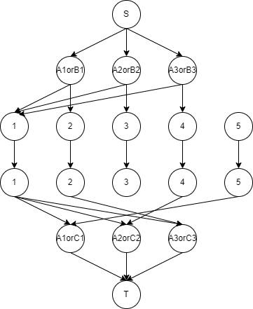 我们称上图中第一排点为 $AB$ 点,第 $i$ 个表示我们需要在 $A_i$ 和 $B_i$;称上图中最后一排点为 $AC$ 点,第 $i$ 个点表示我们需要在 $A_i$ 和 $C_i$;第二排点和第三排点分别表示 $AB$ 和 $AC$ 点选择的值,称其为中间点。我们对于 $AB$ 点和 $AC$ 点连向与它们挨着的那一排中的 $A_i,B_i$ 或是 $A_i,C_i$ 连边。其他连边如上图所示,所有连边的流量都为 $1$。那么,对于这个网络,我们跑最大流,就可以找到一组解。