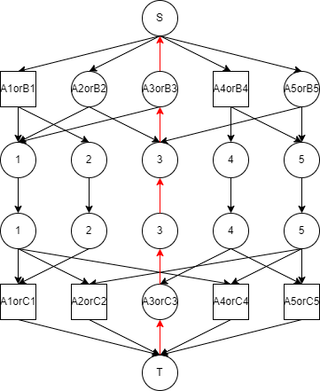 得到这一结论,我们只需要构造一张图,使得其上不存在任何的**待定点**,然后跑一遍最大流即可,显然我们可以在最开始直接钦定我们每一次选择都是 $A_i$。由于每一个 $AB$ 点一定会与一个代表 $A_i$ 的中间相连,而所有 $A_i$ 都被流经,所以图上不存在任何**待定点**。