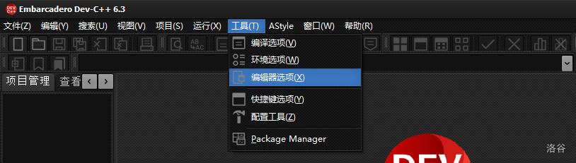 1. Dev-C++ 工具栏选择 `工具(T)` 并点击进入 `编辑器选项(X)`