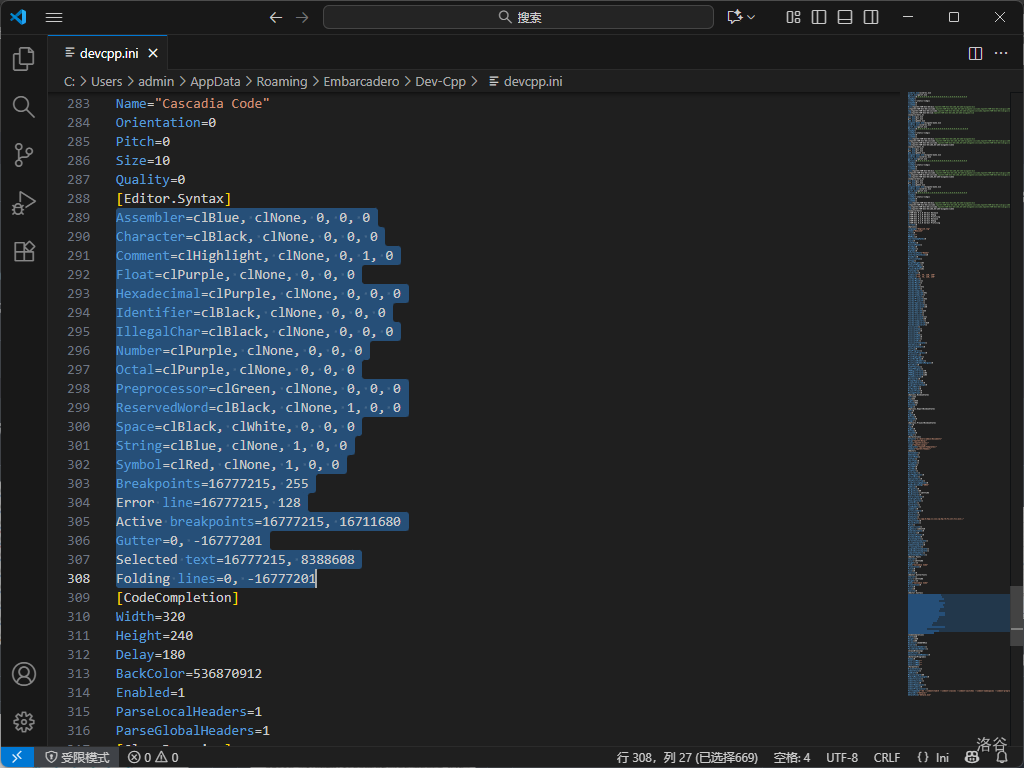 然后你会看见一个 `devcpp.ini` 文件,这就是 Dev C++ 的配置文件。用任意文本编辑器打开它。