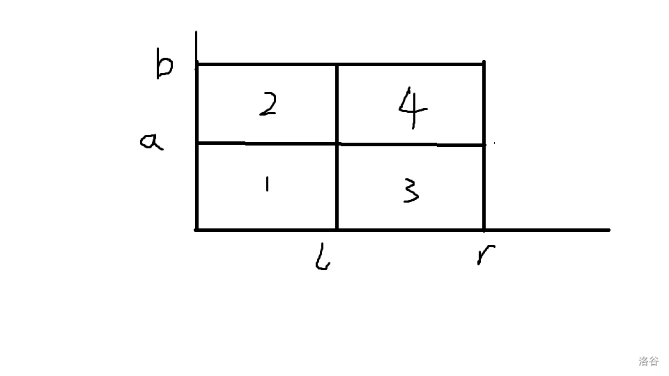 及求第四部分内的顺序对数量。记我们的顺序对为 $(i,j)$,先考虑只有 $j$ 有必要在第四部分内的总贡献 —— 对原图做一次扫描线算出每个点有多少个在之前的逆序对,在做一次扫描线算出只有 $j$ 在第四部分内的总贡献。