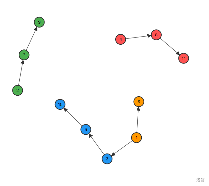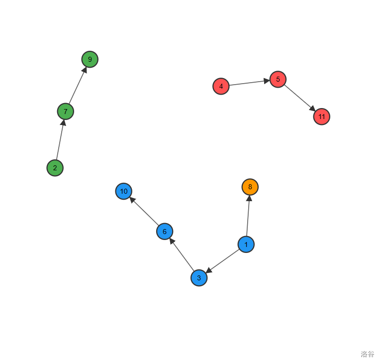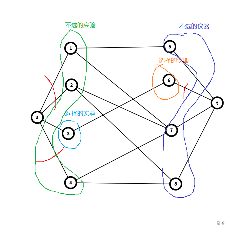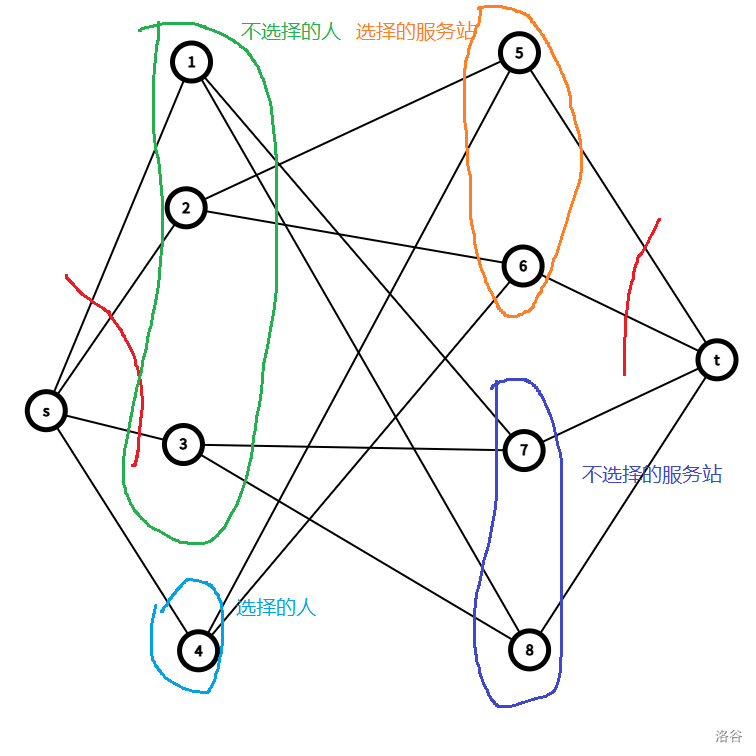 上面的 3 条路径中,除了 \to 7 的路径之外,都跑满了(有一个流量为 1 的限制)