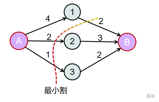 假设最大流为 f,找一个割集,把网络分割成了两个部分,那现在最大流就是 0 了,相当于找的割集得把原来的流阻断。
