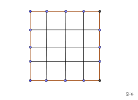 此时由于我们的目的是走到 (n,m),而走到线上任意一个点都可以走到 (n,m),所以我们只要走到线上即可,又有走到第 n-1 列或第 m-1 行就能走到线上,所以题目的要求缩小成了走到第 n-1 列或第 m-1 行。