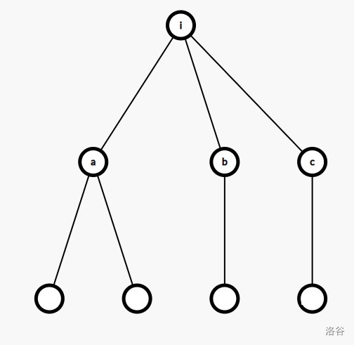 因为已经选了 $i$ 这个点,所以任意几棵子树的答案都是可以合并的,如上图,根据乘法原理和加法原理,节点 $i$ 有三棵分别以 $a,b,c$ 为根的子树,那么 $f_a , f_b, f_c , f_a \times f_b,f_a \times f_c ,f_b \times f_c ,f_a \times f_b \times f_c$ 都应该作为答案累计计入 $f_i$ 中。