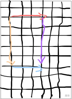 设红色路径代价为 $x$,蓝色路径代价为 $y$,橙色路径代价为 $z$,紫色路径代价为 $w$,这四条路径分别对应点 $P_1,P_2,P_3,P_4$,横向移动距离为 $l_1$,纵向移动距离为 $l_2$。