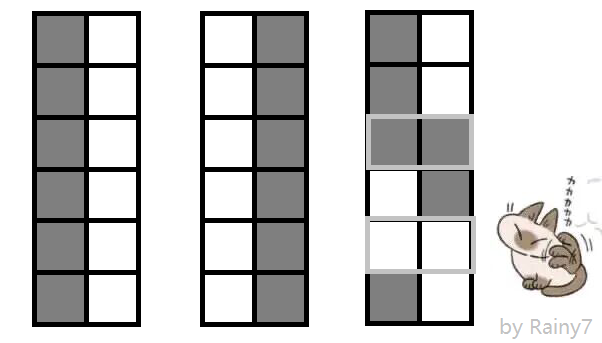 先考虑不存在一个骨牌上两个格子同一个颜色的情况(即保证每个骨牌都是一黑一白)。那么最后的染色结果一定只有 左边都是黑色 或者 右边都是黑色 的 2 种情况。