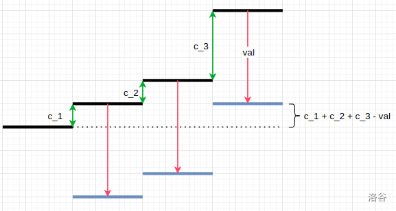 那么发现我们只需要找到第一处差分数组之和大于等于下降高度 $val$ 的地方,修改其值即可。