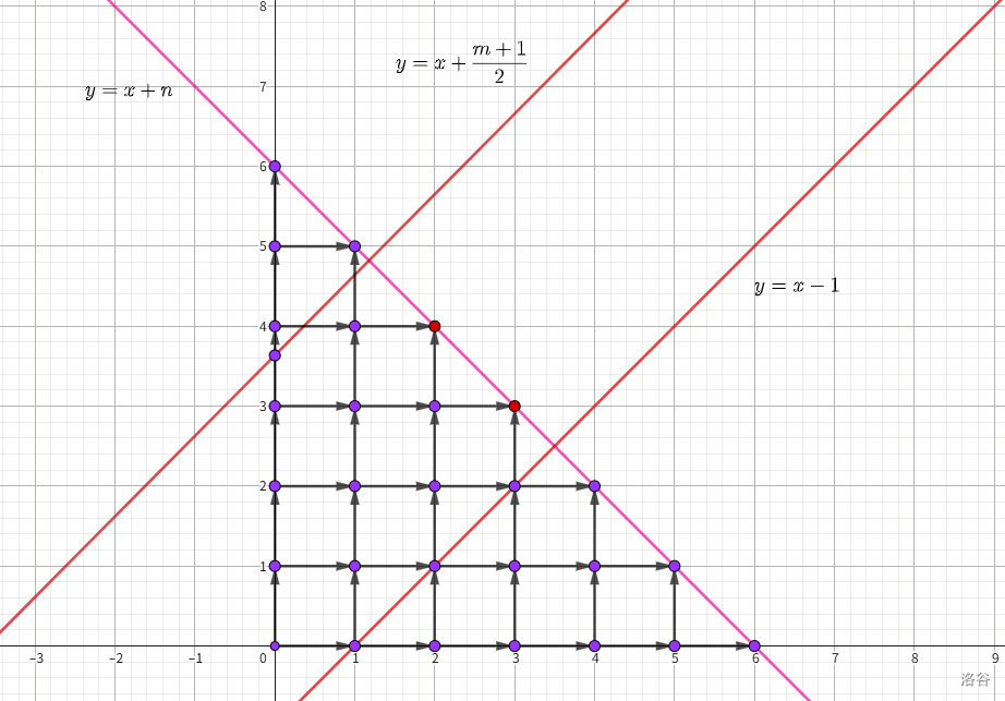 也就是说,对于不越过 y=x+k 的情况,不合法方案数相当于作 (n,m) 关于直线 y=x+k+1/y=x+k-1 对称得到 (n',m') 后,(0,0) 到 (n',m') 的路径数。