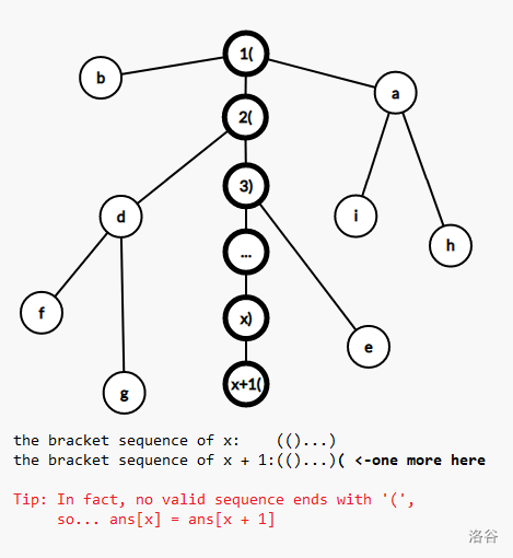 那么,有一种想法,就是dfs整棵树,将父节点的答案下传到子节点,然后判断以最后一个括号为结尾的合法括号序列有多少就可以了。