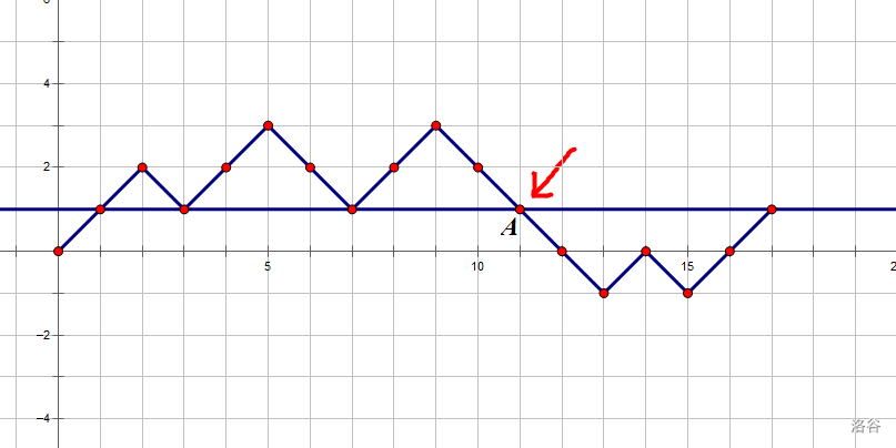求以点A结尾的合法区间个数时,发现在x坐标为1的点至A点之间的点都是不低于A点的,所以左端点的取值可以在 `[1, A - 1]` 之间,而在合法区间内有3个高度与A相等的点,事实上这些点都可以作为左端点,所以以A为右端点的合法括号序列子串有3个。