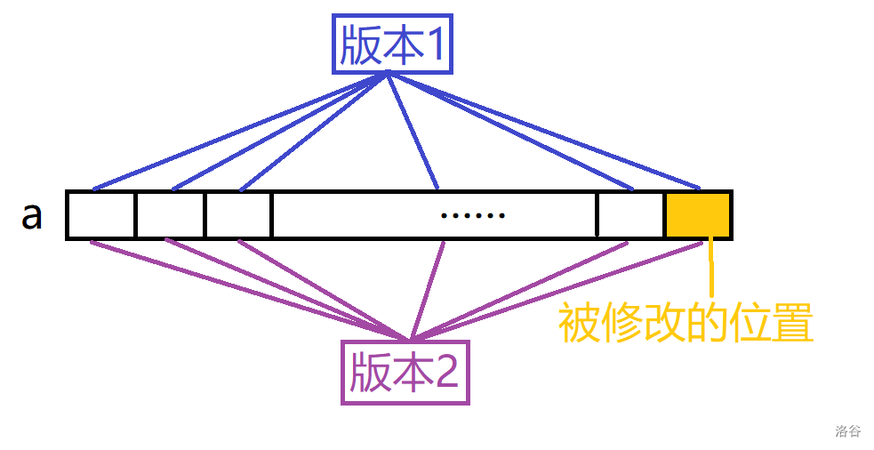 一个比较自然的暴力做法,是定义一个数组 $b_{i, j}$ 表示版本 $i$ 下标为 $j$ 的 $a$ 数组的值,虽然时间是 $O(1)$ 的,但是空间是 $O(nm)$ 的,显然超出空间限制。