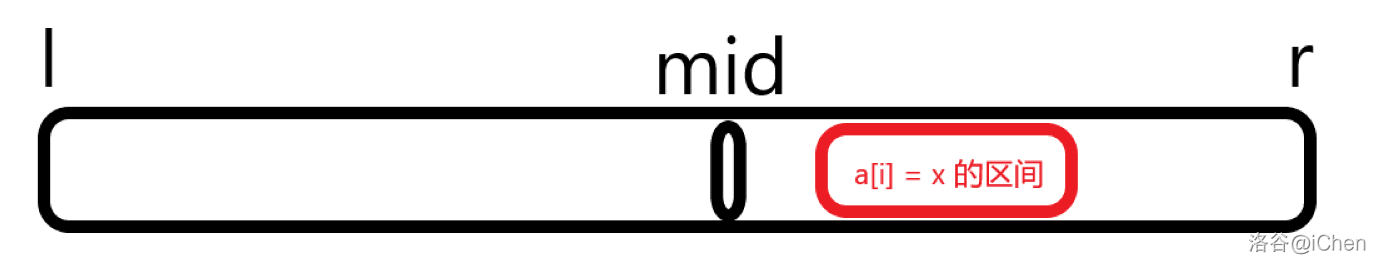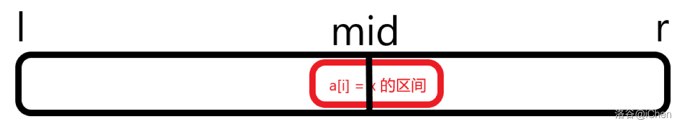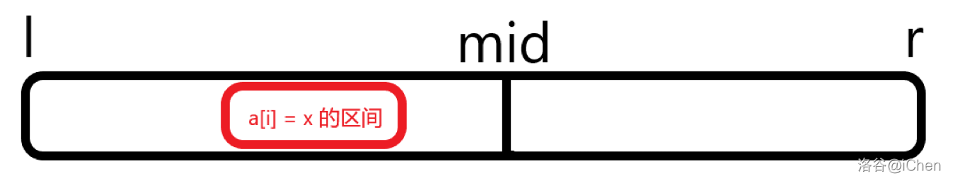 如图,如果我们发现 $a_{mid} < x$,那么可以直接缩小区间到 $[mid + 1, r]$,使得我们想要的答案(红的区间的最左边端点)依然在区间内。