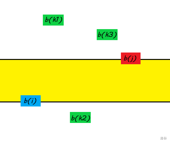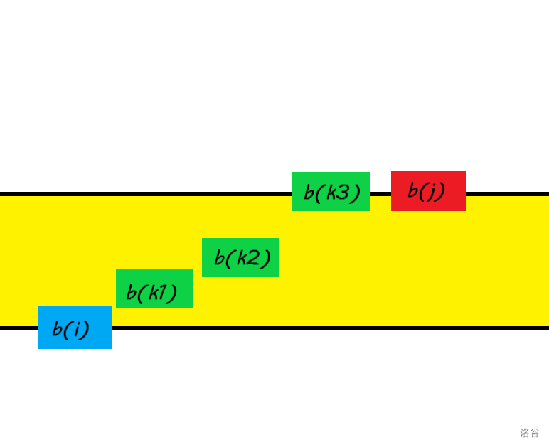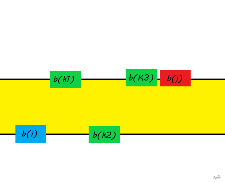 注意这三个数都不在图中的黄色区域里面或边上,不然它们就应该是最长不下降子序列的一部分,即有:$b_i$ 和 $b_j$ 间任何一个数 $b_k$ 都满足 $b_k>b_j$ 或 $b_k<b_i$ 。