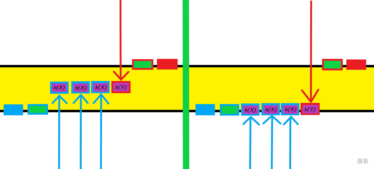分析一下中间连在一起紫色的那一堆数(“紫色平板”),将它们分为两类: $b_X$ 和 $b_Y$ ,在被改变之前,有 $b_X<b_i$ , $b_Y>b_j$ 。也就是说 $b_X$ 是从黄色区域下方“升”上来的, $b_Y$ 是从黄色区域上方“降”下来的。