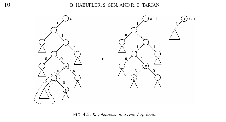 满半树跟二项树等价,实际上一棵满半树就是二项树的左儿子右兄弟表示,如果把“右兄弟”当作右儿子的话。如果没有 decrease key,那么 RP-Heap 跟懒惰二项堆(不带级联剪切的斐波那契堆)几乎完全一致。