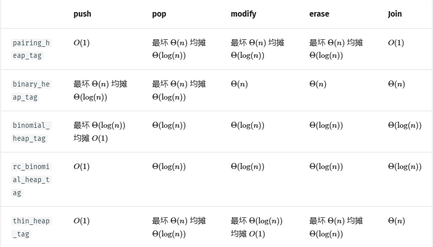 提供了五种可用的优先队列,即 `binary_heap_tag`、`pairing_heap_tag`、`binomial_heap_tag`、`rc_binomial_heap_tag`、`binary_heap_tag` 和 `thin_heap_tag`,分别是二叉堆、配对堆、二项堆、冗余计数二项堆和一种 tarjan 发明的除了合并外跟斐波那契堆堆复杂度一样的堆。