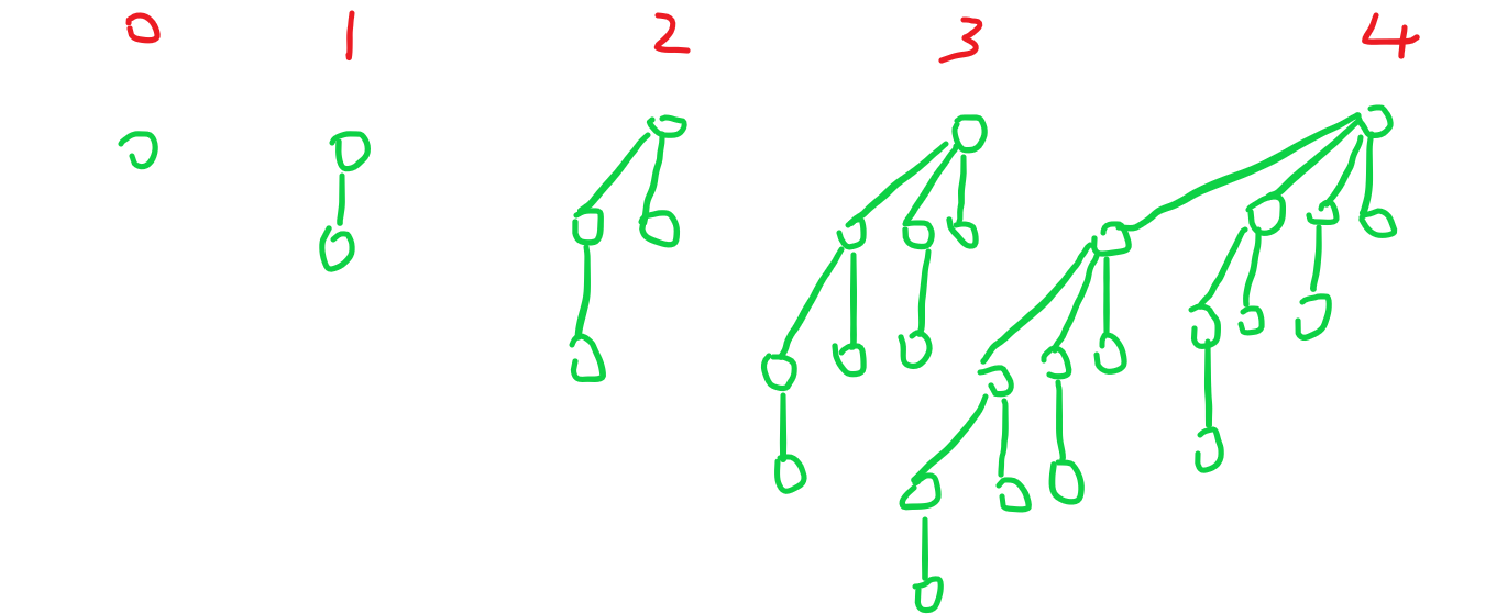 2. $k$ 级二项树有恰好个儿子 $k - 1$,每个儿子为 $0,\,1,\,2,\,3,\,\dots,,\,k - 1$ 级二项树。