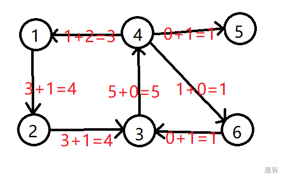容易发现,现在还存在一条 $1\to 2\to 3\to 4$ 的增广路,于是我们对于这一条增广路满流,可以得到下面的图: