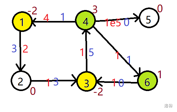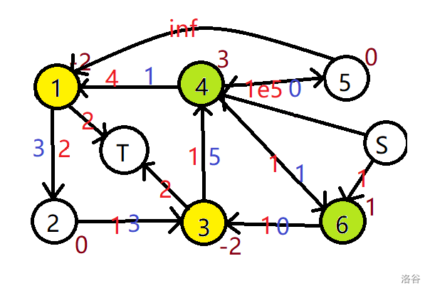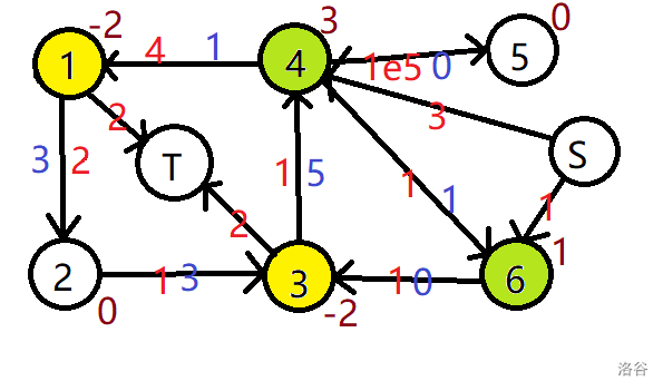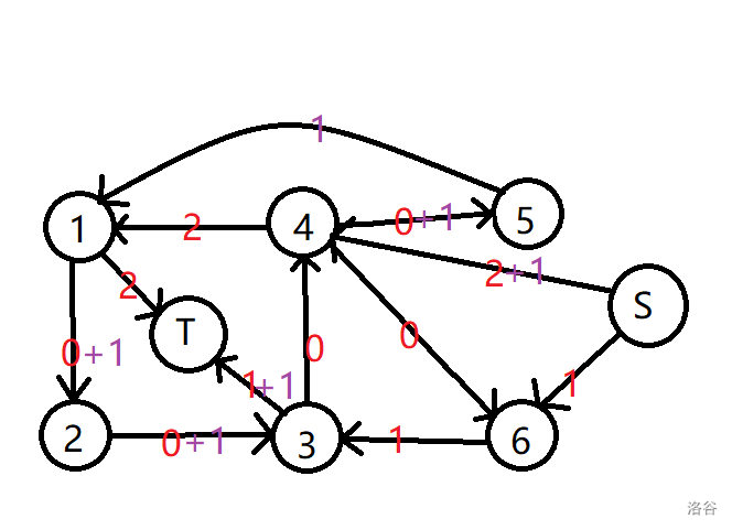 我们建立超级源点和超级汇点,使用上下界网络流的思路建图,费用为 $0$,因为我们不希望这些多出来的边干扰我们的费用结果。然后,我们需要关心的就是上下界费用流该怎么求了。