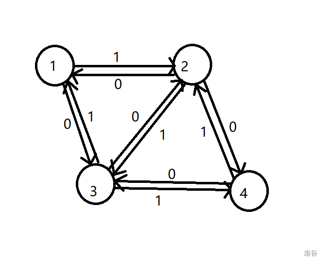 每次找到一条增广路,满流的时候,我们在反向边也相应的**加上**流量,表示从这条边以后可以“退回”这个流量。例如上面的图,假如我们走了 $1\to 3\to 2\to 4$ 这一条错误的增广路之后,就变成了这样: