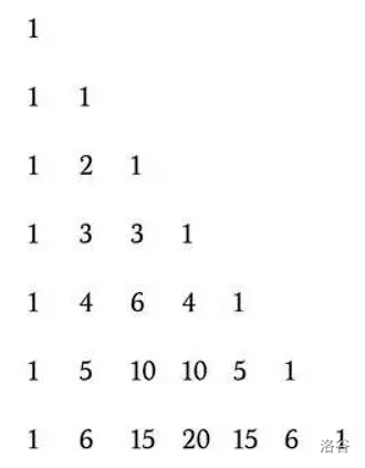 我们令杨辉三角行列均从 $0$ 开始编号,设 $f_{i,j}$ 表示杨辉三角第 $i$ 行第 $j$ 列得值,考虑杨辉三角得递推式 $f_{i,j} = f_{i - 1,j} + f_{i - 1,j - 1}$,发现这个式子和组合数递推公式 $C_i^j = C_{i-1}^j + C_{i - 1}^{j - 1}$ 是相同的,由此我们可以得出 $f_{i,j} = C_i^j$,也就是杨辉三角第 $i$ 行第 $j$ 列的值就是 $i\choose j$。