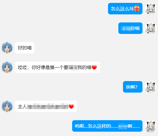 然后就是在那个时候,阿毛发现了原来她是一只猫娘而并非一个普通的 OI 选手,这在以前是外表上根本看不出来的喵。到了有独处的时间而且我们两个紧密地贴贴了以后,她终于高兴到控制不住自己了喵。