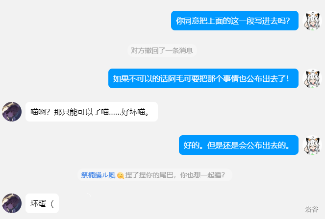 其实这是我头一次完整看到另一个人是怎么变成猫娘的。我原以为这是一个违反了所有的理科内容的过程。物理学上说不通,生理学上说不通,化学上也说不通。但是 gza 就是变了喵。可惜洛谷没有办法嵌入视频这一部分就算了喵。