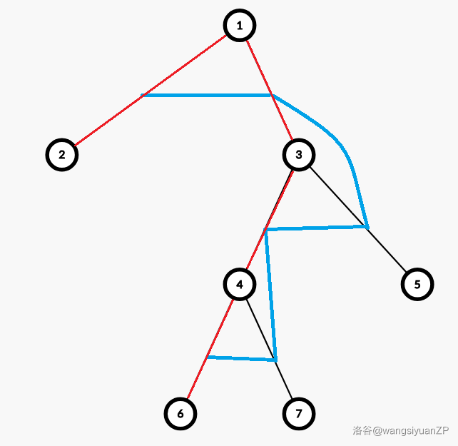 其中,蓝色边是新生成的树,红色边是可能作为根节点的原始边。