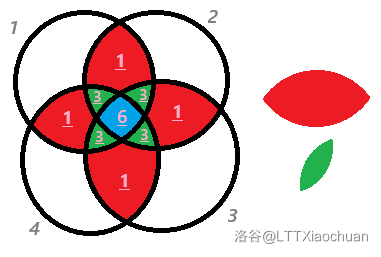 其它种的同理,都是利用我们需要的集合(下图右,即最开始选出来的那些)产生出来额外的交集。比如 $4$ 个性质的,就相当于从 $4$ 个性质中任选 $2$ 个,每两个我们需要的集合就能产生一个重叠。于是,对于 $k$ 个性质的 $S_k$,单组性质产生的重叠数量就是 $\binom{k}{r}$ 了。希望下面的配图能帮助读者(笔者?)更好理解。