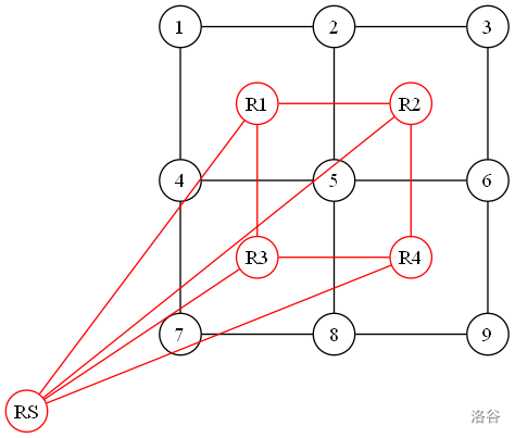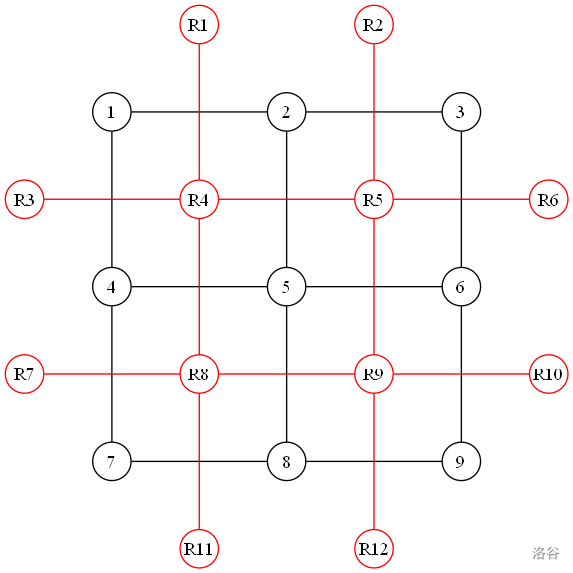 我们还是以 $3\times 3$ 网格图为例(参考图 2),我们发现由于对偶图的每一条边都恰好交一个原图上的边,即对偶图上的边可以对应删掉对应边(的代价)。