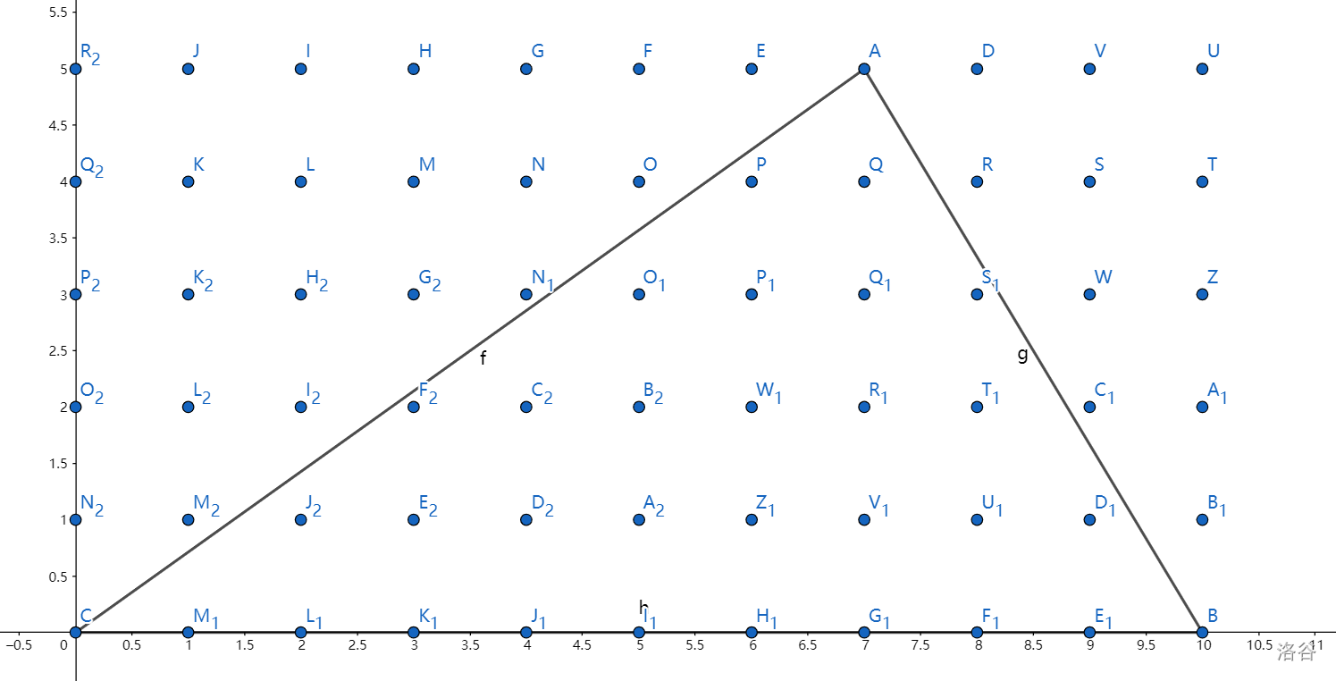 $p+1$ 是 BC 边上的格点数,$\gcd(n,m)+1$ 是 AC 边上的格点数(看经过了几个最小矩形),$\gcd(|n-p|,m)+1$ 是 AB 边上的格点数(同理)。最后,因为三个顶点被多算了一次,减掉 3。