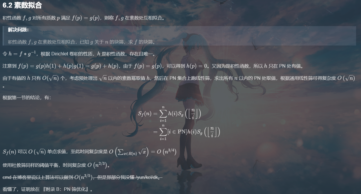 若预处理 f * g 在所有 [1,B] 处的函数值(B \ge \sqrt n ),则仅需对 x > B 的部分使用双曲法,复杂度为 O\left(B + \sum_{x \in R(n), x > B}\right) = O(B + \frac{n}{\sqrt B}) ,取 B = n^{2 / 3} 平衡得到 O(n^{2 / 3}) 。