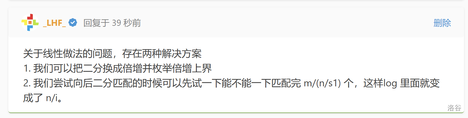 类似分块,取 $B=\frac{n}{|s_1|}$。我们先尝试匹配 $B$ 个 $s_1$,也就是说每次匹配都可以往前推动 $n$ 个位置。之后剩下的部分不会超过 $B$ 个,二分出剩下内容具体有几个。而前面一次推进 $B$ 个的部分,至多反悔掉一次,后面二分,就变成了 $\mathcal O(\log B)$。每次至少可以填充 $|s_2|$ 个。这里计算一次答案复杂度就变成了 $\mathcal O(\frac{m}{|s_2|}\log B)$,总复杂度由于 $\mathcal O(\sum\limits_{i=1}^n\log(\frac n i))=\mathcal O(n)$ 所以是 $\mathcal O(m)$ 的。
