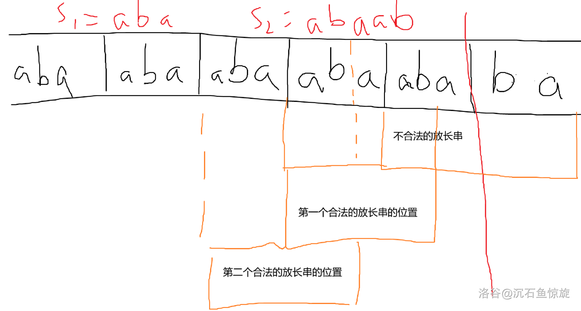 在 $k=3$ 的时候 $s_1=\texttt{aba},s_2=\texttt{abaab}$,此时我们先填充了 $2$ 个短串,但是只撤销 $c=1$ 个就会判成无解,std 的锅就是这么出的。只有在 $s_2$ 的『尾巴』部分是 $s_1$ 的前缀的时候才会出现这种情况。
