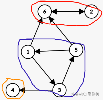 强连通分量:对于一个有向图,任意两点能够互相到达的极大连通子图为强连通分量。