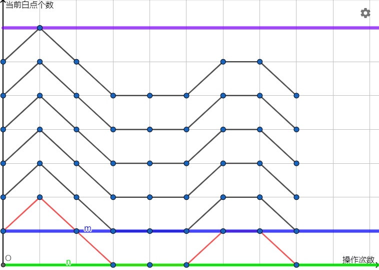 比如说像上图一样,用一条折线代表一种情况。尽管两种情况初始白球数量不一样,结束时白球数量不一样,但是拿出来的球颜色序列是一样的。