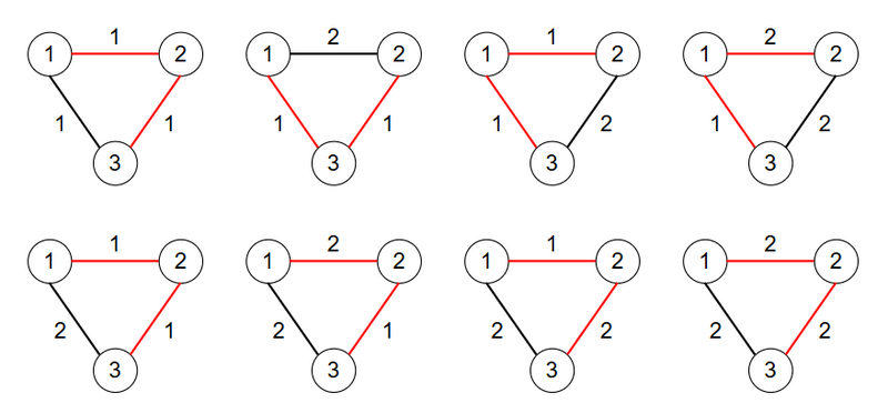 辺の重みが $ 1 $ または $ 2 $ である $ 3 $ 頂点の重み付き完全グラフは以下の $ 8 $ つあります。それぞれの完全グラフについて、最小全域木に含まれる辺は赤色で塗られています。