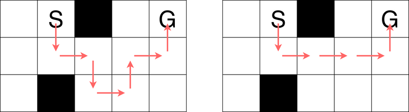 Note that you cannot take a path that moves horizontally (or vertically) consecutively without alternating as shown in the right figure.