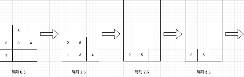 - グリッドの下から $ 1 $ 行目がすべてブロックで埋まっているならば、下から $ 1 $ 行目にあるブロックをすべて消滅させる。