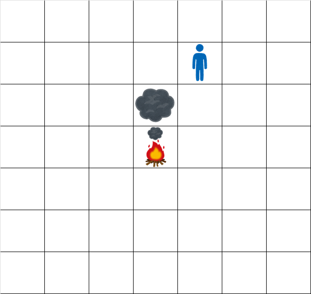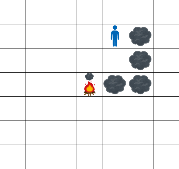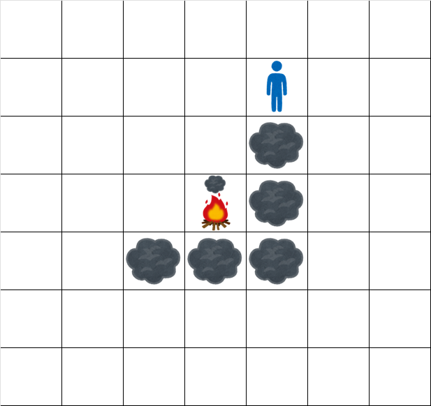 時刻 $ t=0 $ では、マス $ (0,0) $ にのみ煙が存在します。