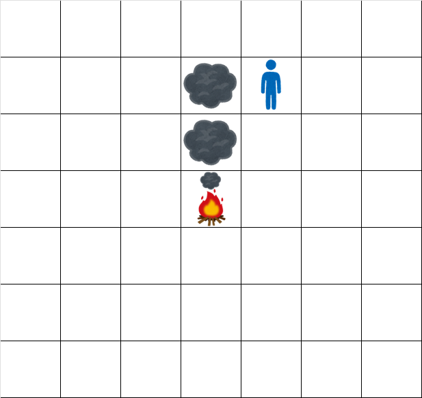 時刻 $ 1.5,2.5,4.5,6.5 $ ではマス $ (-2,1) $ には煙が存在せず、時刻 $ 3.5,5.5 $ ではマス $ (-2,1) $ に煙が存在します。