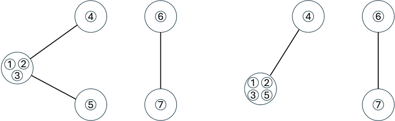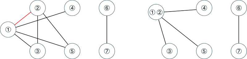 $ 1 $ 回目の操作では、駒 $ 1 $ と駒 $ 2 $ が置かれている頂点の間の辺(下図左)の縮約を行います。