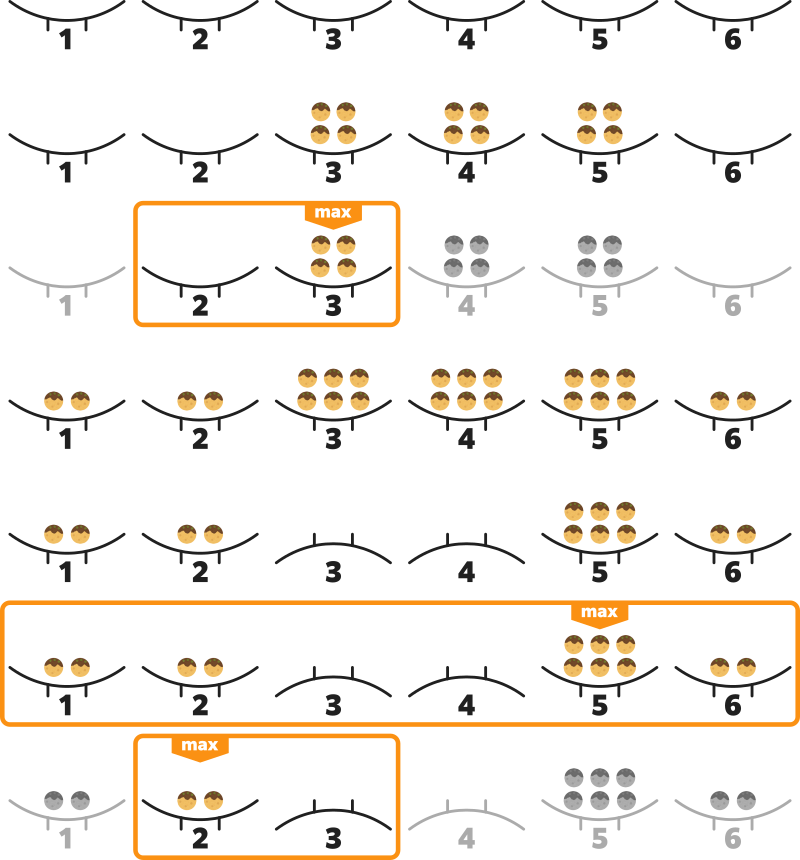 处理第 $5$ 次询问时,盘子 $1$ 至盘子 $6$ 中章鱼烧数量最多的是盘子 $5$,因此第二行输出盘子 $5$ 中的章鱼烧数量 $6$。