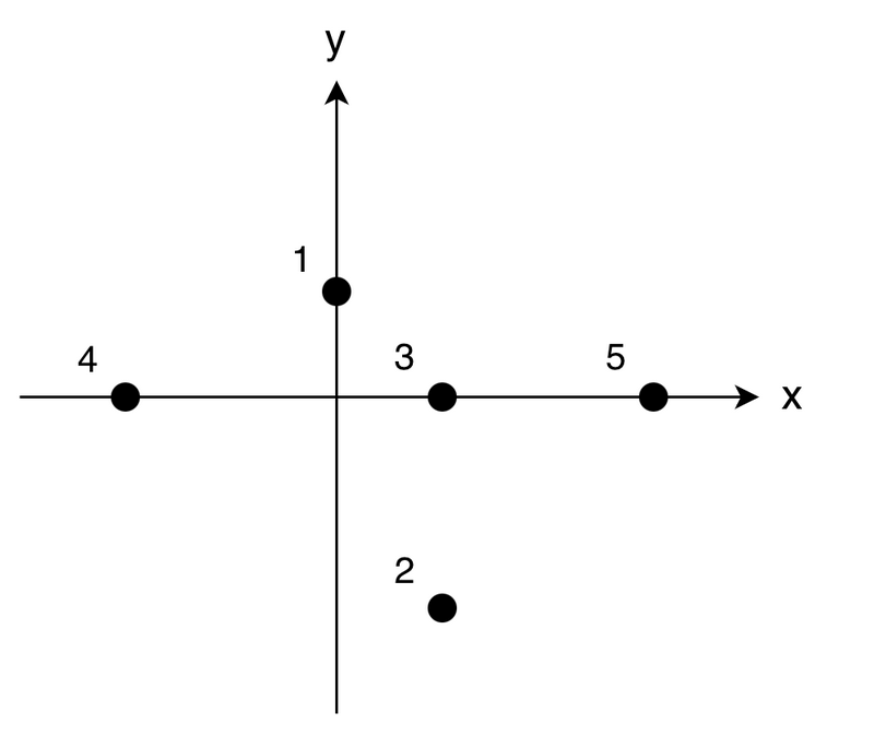 - $ 2 $ 個目の思考実験:はじめ、高橋君はモンスター $ 1 $ がいる方向を向いています(このとき、モンスター $ 1 $ が消滅します)。 ここから時計回りに回転を続けると、途中モンスター $ 3,5 $ がいる方向を向くため、これらが消滅します。 さらに回転を続けると、途中モンスター $ 2 $ がいる方向を向くため、これが消滅します。 最終的にモンスター $ 4 $ がいる方向を向いた瞬間に停止します(このとき、モンスター $ 4 $ が消滅します)。 よって、答えは $ 5 $ です。