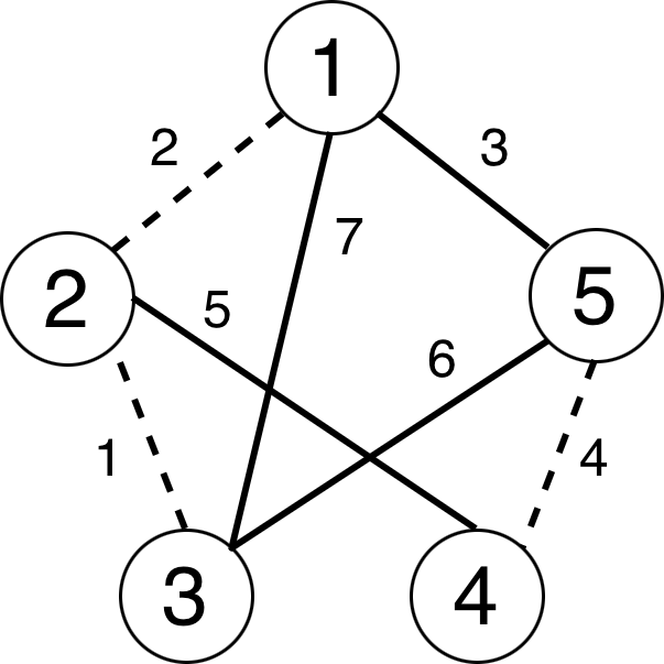 给定一个包含 $N$ 个顶点和 $M$ 条边的简单连通无向图 $G$(其中 $N \ge 2$)。顶点编号为 $1$ 到 $N$,边编号为 $1$ 到 $M$;第 $i$ 条边连接顶点 $U_i$ 和 $V_i$。每条边有一个**代价**,第 $i$ 条边的代价为 $2^i$。